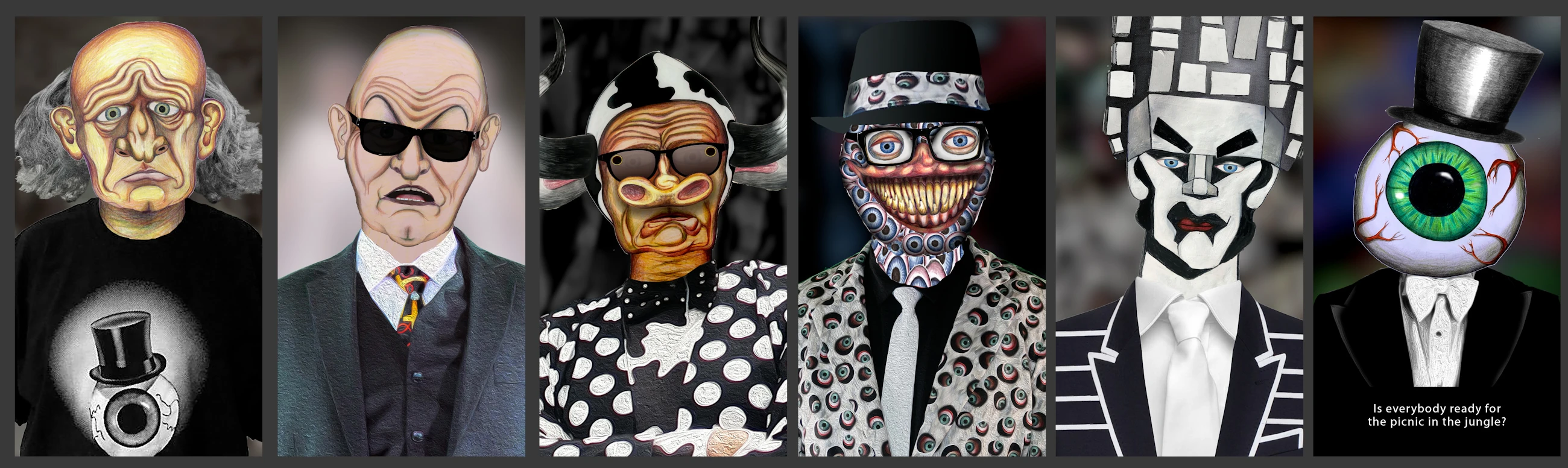 The six Singing Resident avatars which hosted the show; by artists Leigh Barbier, David Lawrence, Steve Horwath and John Sanborn