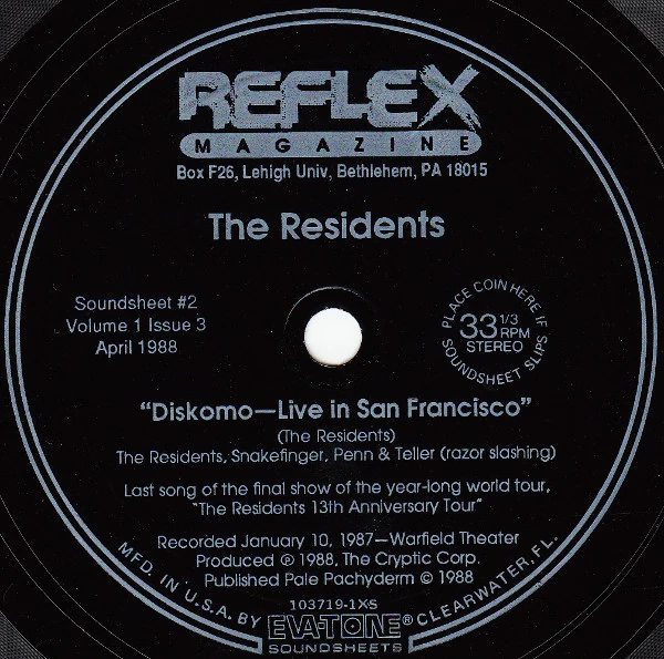 As the second encore for the final 13th Anniversary Show, in 1987, The Residents performed a one off heavy guitar lead Big Bubble inspired version of Diskomo. It was released as a single on a Flexi-disc in 1988 with the April copy of Reflex Magazine. It featured Snakefinger, Penn & Teller